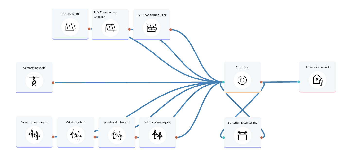 An industrial site with an annual electricity consumption of 26 GWh and a peak load of 6.3 MW is aiming to increase its self-sufficiency rate and reduce its grid connection power by expanding PV, wind power and a battery. This is shown in four different scenarios. Lifetime: 20 years
