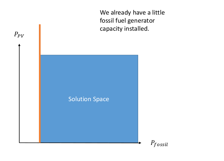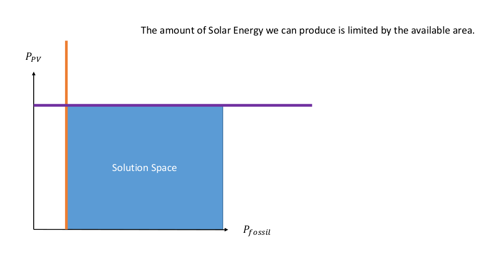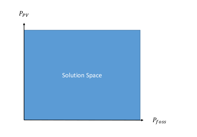We can now represent this graphically as a solution space, which shows us all the possible input combinations. On the x-axis we have the fossil fuel generator capacity, and on the y-axis we have the capacity of a PV plant. Any point within the solution space is a possible solution, and using linear optimization, we will find the optimum.