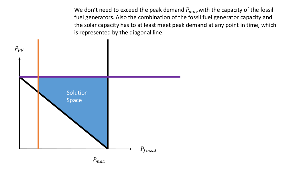 We also have to be able to meet the peak demand. We need to make sure that we have enough capacity installed to meet this demand, which is depicted by the diagonal line, which shows us all the combinations of solar and fossil fuel capacity that let us meet peak demand. However, all the solutions above the diagonal line are also theoretically possible.
