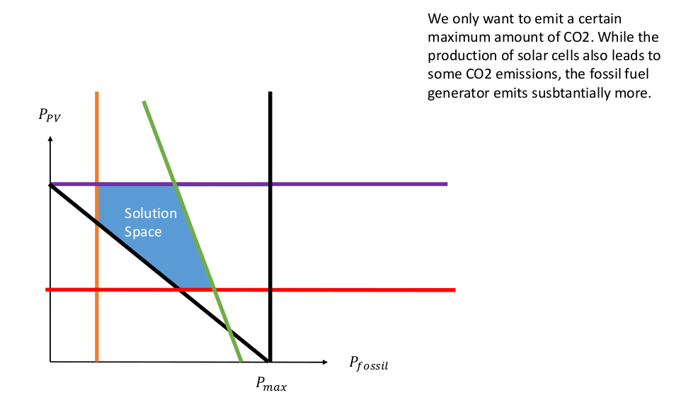 Finally, we also want to make sure that our energy system is sustainable, and therefore, we define a maximum amount of CO2 that we want to emit, which is represented by the green line. After having reduced the solution space again, we now turn to solving the optimization problem.