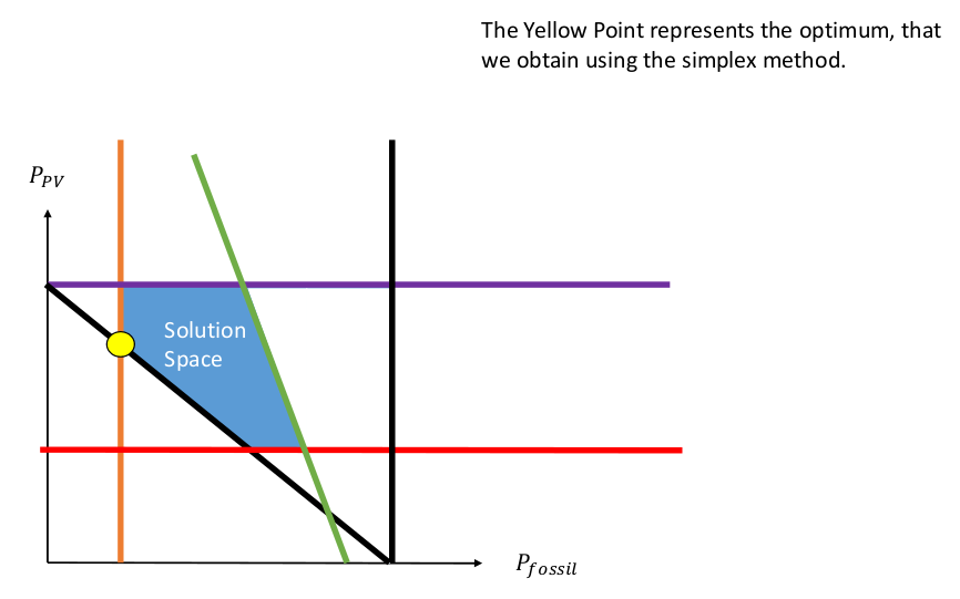 In open-plan-tool this is done by a solver, which can solve the optimization, given that the equations are in a certain form. The solver then proceeds in two steps. In the first step, it checks if there is a solution to the problem, and as soon as a solution is found, the solver proceeds to the second step. In the second step, the solver then tries to find a better solution and continues this process iteratively until it has found the best solution. To do this, the solver moves along the edges of the solutions space, as the optimum will always lie on the edge of the solution space in a linear optimization model as long as there is an optimum. In our simple example, this means that the solution has to lie somewhere on the edge of our solutions space. In this case the solution is the yellow point.