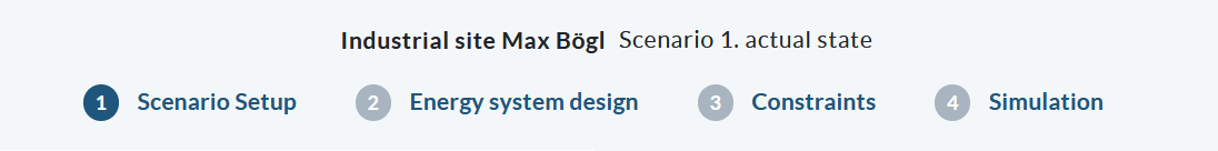 At the top you will see the name of the project (in bold type), the name of the scenario, the four steps for scenario creation, and an identifier which step you are in.