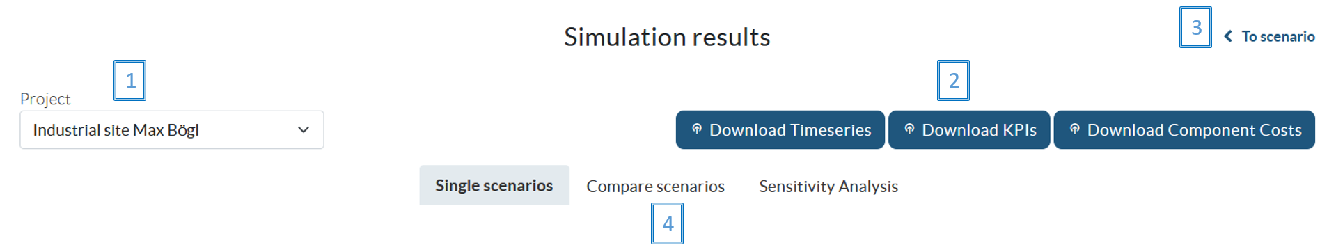 In the upper right part you have the possibility to download all timeseries of the scenario including given timeseries and simulation results, the resulting Key Performance Indicators (KPIs), and the component costs as Excel files [3]. Further you can return to the scenario setup [4].