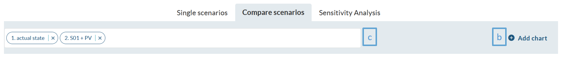 It is also possible to compare the results of multiple scenarios. You only need to include the scenarios to be compared (c). Remember that you can add additional charts if necessary (b).