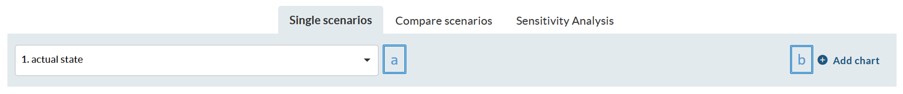 This option makes it easy to view the results of one scenario at a time. On the left is a drop-down menu where the scenario is selected (a) and on the right is the option to add a new chart (b).
