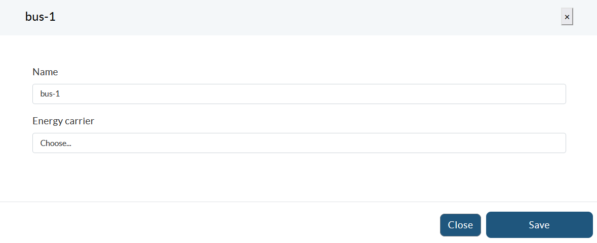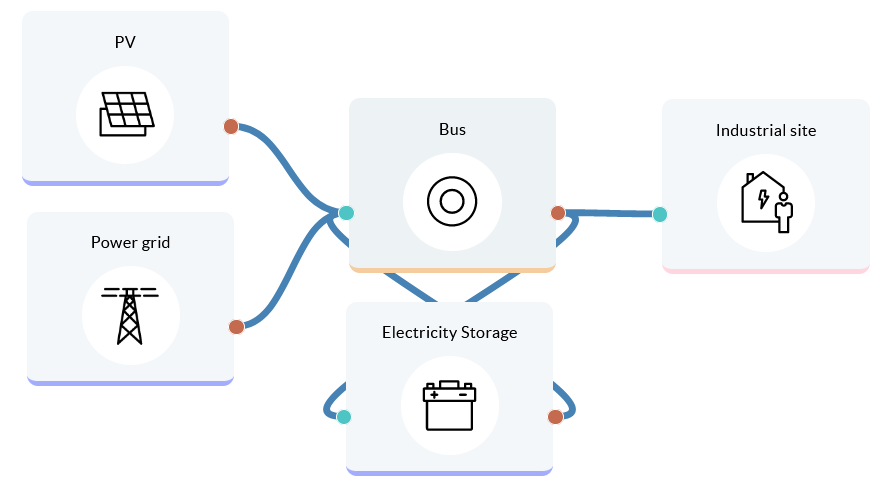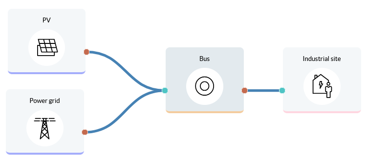 In this section the energy system will be designed using different components, which are located on the left panel and classified in different categories: Providers, Production, Conversion, Storage, Demand and Bus. In the graphic panel drag the components you need to design your energy system and do not forget to include the buses. Note that assets are connected to each other using a bus which is the identifier for the energy carrier (e.g. electricity or heat). Interconnecting two buses or two assets directly is not allowed. Connect the components together using the green and red terminals. The green terminals represent inputs, while the red terminals represent outputs, see the following example: