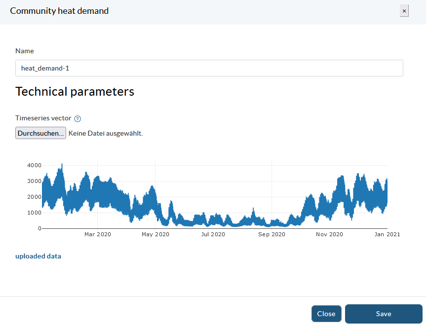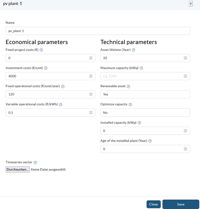 When you click on the components, a screen appears where you can configure the different parameters. The input parameters are different for each component category, however, you will typically find three ways to complete the information: spaces to enter values, drop-down lists with default information or buttons to load time series (in this case, a graph will be displayed where the loaded data series can be previewed). The input field for the components that belong to one category (e.g. the conversion components) contains usually the same parameters, but there are also components that may differ slightly, such as the heat pump. Below we show you as an example some of the component setup screens.