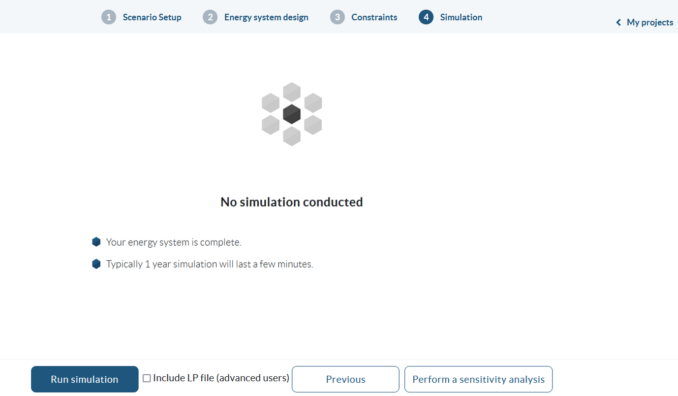 Further you can select the option whether you want to include an LP file. With the LP file you can look the mathematical formulation consisting of objective function and constraints. It is recommended to choose a small number of days to evaluate (e.g. one day) to keep the LP file readable. After running the simulation you can download the LP file and open it in a text editor.